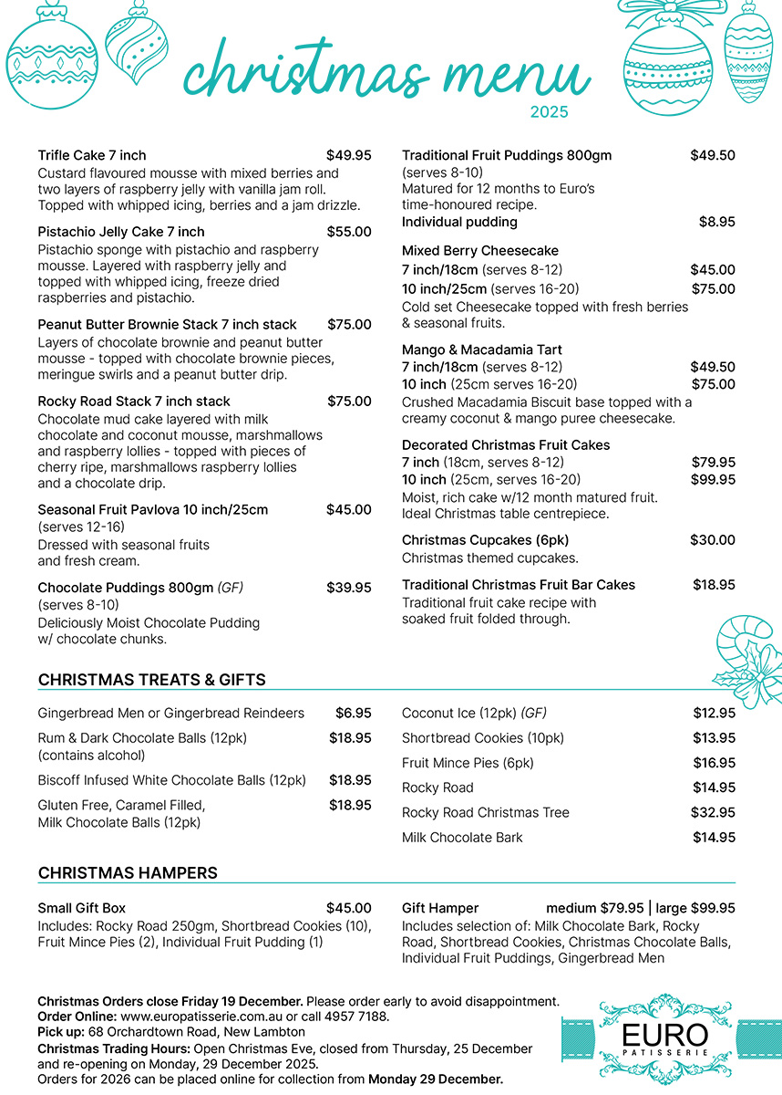 Ready to go cakes and gateaux baked in house at our New Lambton Patisserie. Simply order online or in store. Perfect for any occasion whether it be a celebration or even just for afternoon tea you will find the perfect cake for you at Euro.